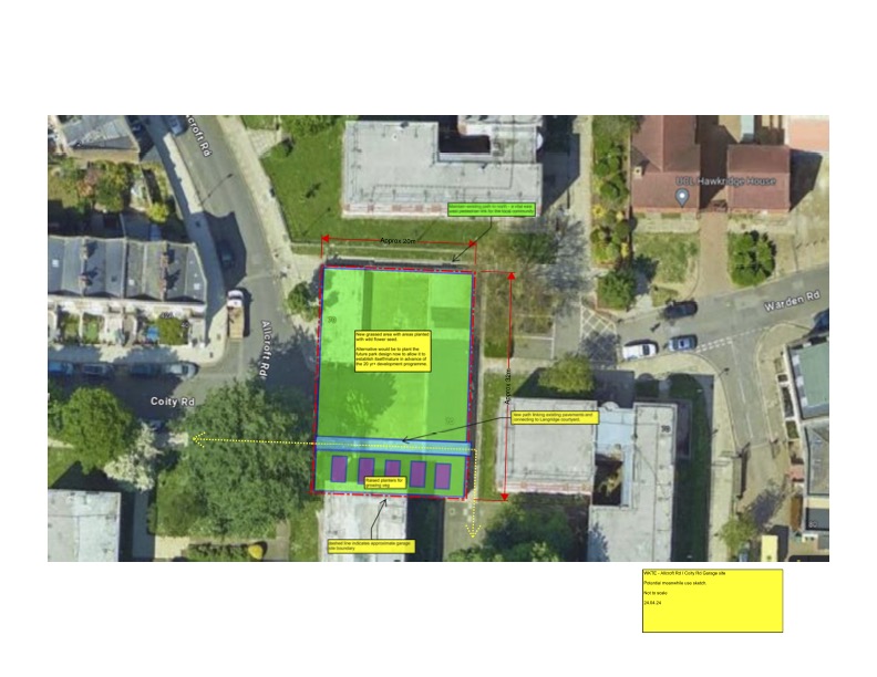 Camden Council have now demolished the three garage sites on the estate, impacting residents who used the garages for parking, storage and hobbies. As the regeneration is much delayed and a planning application has not yet been submitted, it is going to be another couple of years before construction starts. We think that Camden Council is morally obliged to provide meanwhile uses of all these sites prior to commencement of construction. This could include raised beds for food growing, grassed areas for play and areas for nature and biodiversity (see illustrative plan above), or temporary workspace and storage facilities.