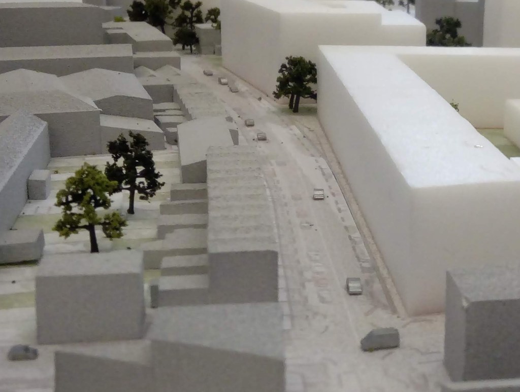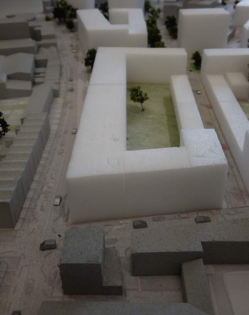 In this illustration the existing trees along Grafton Road are removed. There is no space for proper front gardens as on the opposite side of the road. The block model of the same proposal (below) shows that the new buildings will be built right up to the edge of the pavement, like the example in Old Street.