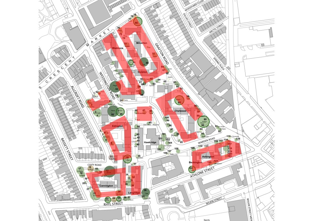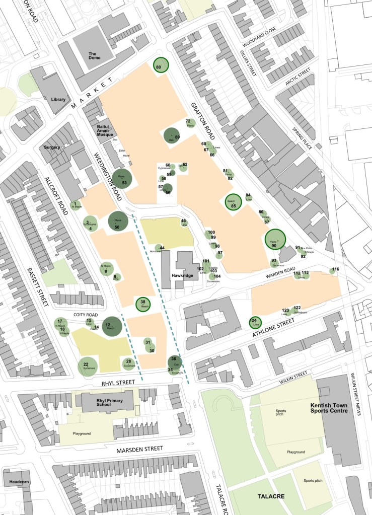 The trees on and around West Kentish Town estate are under threat from Camden’s redevelopment of the estate. Initial designs published by Camden show a lack of understanding of the importance of mature trees for the current and future well-being of Camden residents. Previous consultations show that the whole of our community is in agreement that the trees are an asset and a feature of the neighbourhood to be retained. However, the initial design (below) show at least 35 out of the 56 priority trees are lost