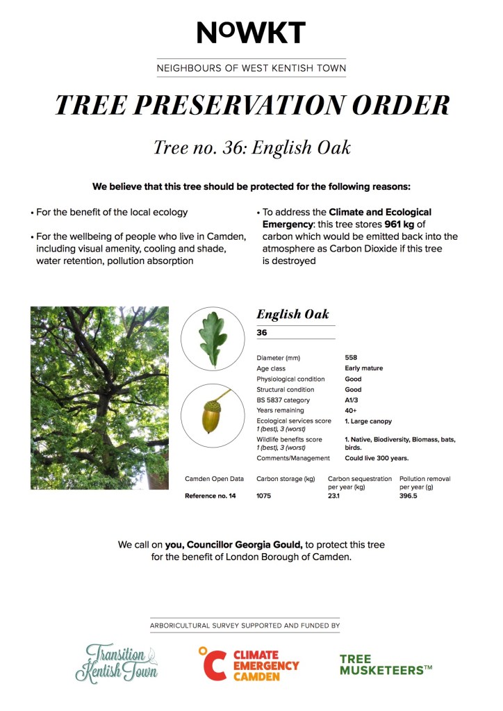 On 15th August 2020 Neighbours of West Kentish Town asked the Planning Department and all councillors of Camden Council to protect the 56 priority trees with a TREE PROTECTION ORDER for each tree. We have received the support of several councillors, but have yet to hear back from the Planning Department.